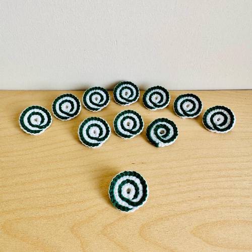 Şeker broşlar, organik sertifikalı pamuk ip ile elde örülerek üretilmiştir.